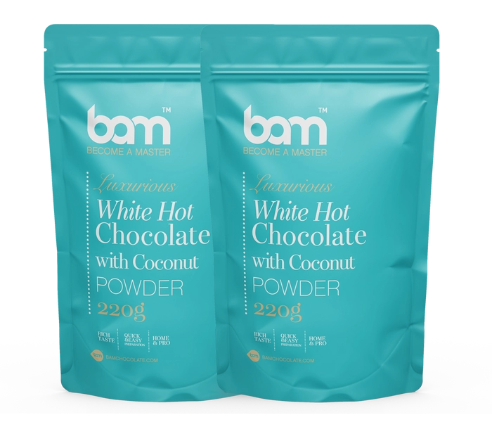 DUO Cioccolata calda bianca al cocco (2x220 g) è una cioccolata calda cremosa, ricca di gusto e dello spessore giusto per dare calore alle fredde giornate autunnali e invernali. Le papille gustative saranno deliziate dal gusto tropicale del cocco, che può essere esaltato dall'aggiunta di cialde croccanti o di panna dolce montata. La cioccolata calda al cocco è contenuta in una pratica confezione che consente di preparare sette porzioni. È incluso anche un misurino per facilitare il dosaggio. Questa deliziosa bevanda calda si abbina perfettamente ai mini marshmallows BAM e si può scegliere tra il gusto della cioccolata calda bianca con nocciole o il gusto decadente della cioccolata calda extra fondente.