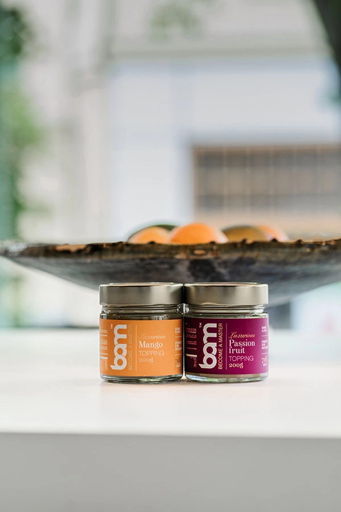 La confezione di topping BAM Tropical contiene topping BAM al frutto della passione (200 g), topping BAM al mango (200 g) e topping BAM al cocco (200 ml).