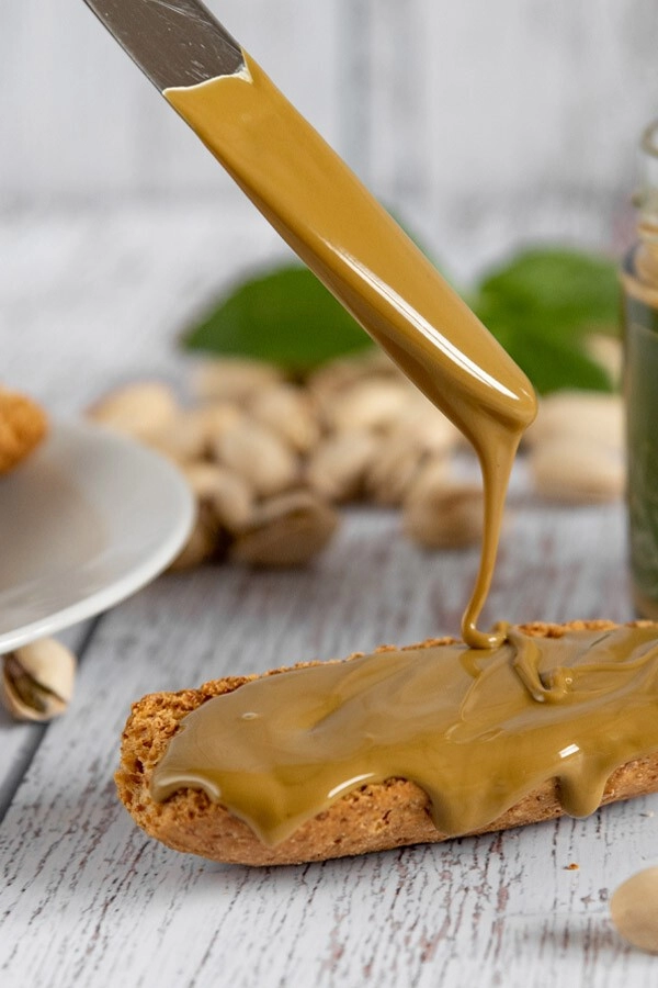 Pastadi pistacchio (50%), zucchero di canna, burro anidro, latte intero in polvere, emulsionante: lecitina di girasole, sale di Cervia.