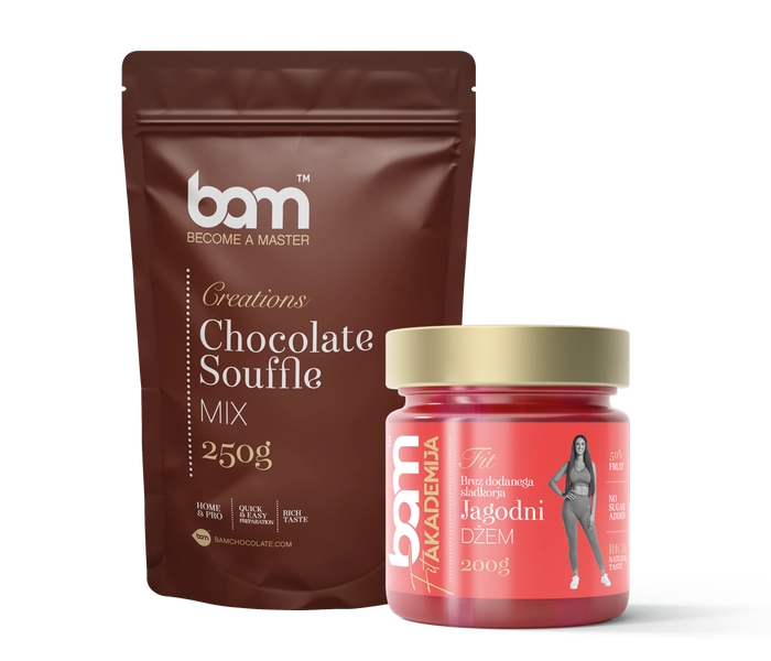 Il set BAM Soufflé con fragole contiene il Mix per soufflé al cioccolato (250 g) e il topping alla fragola (200 g). La confezione crea un dessert al cioccolato arioso e soffice che stupirà chi ama i dessert con i lamponi. La preparazione di questo delizioso soufflé al cioccolato è così facile e veloce che è la scelta perfetta per una cena romantica. L'impasto aiuta a creare un dessert elegante anche quando non c'è molto tempo.