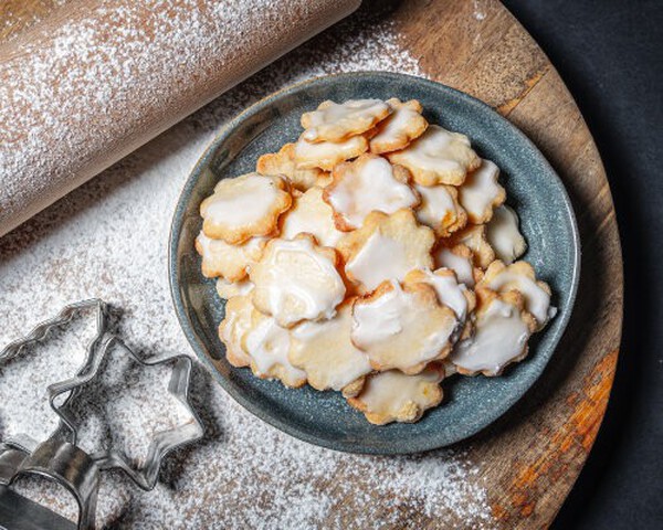 Preparare la glassa. Sbattere lo zucchero a velo e il succo di limone fino a ottenere un composto omogeneo. Se si desidera, aggiungere altro zucchero a velo per addensare o altro succo di limone per diluire. Versare sui biscotti. Cospargere con foglie di mandorle affettate, se si desidera.