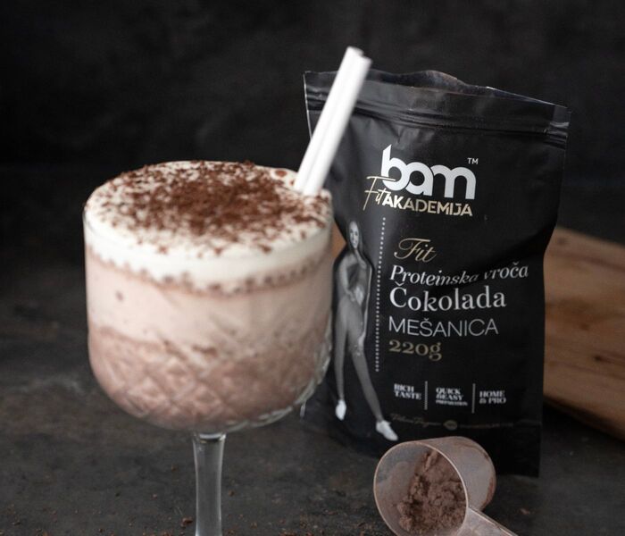 In un frullatore, unire il ghiaccio, il latte e la cioccolata calda proteica BAM. Frullare fino a ottenere un composto omogeneo.