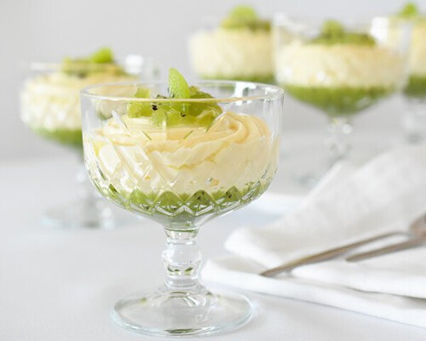 3 Riempi una sac a poche con la crema (se necessario, prima sbattila fino a renderla omogenea) e versala nei bicchieri. Taglia del kiwi a cubetti e usalo per decorare la parte superiore.