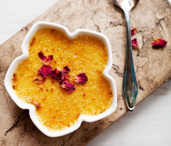 Poco prima di servire, cospargere uno strato uniforme di zucchero di canna. Caramellare lo zucchero con un fornello a gas fino a renderlo dorato e croccante.