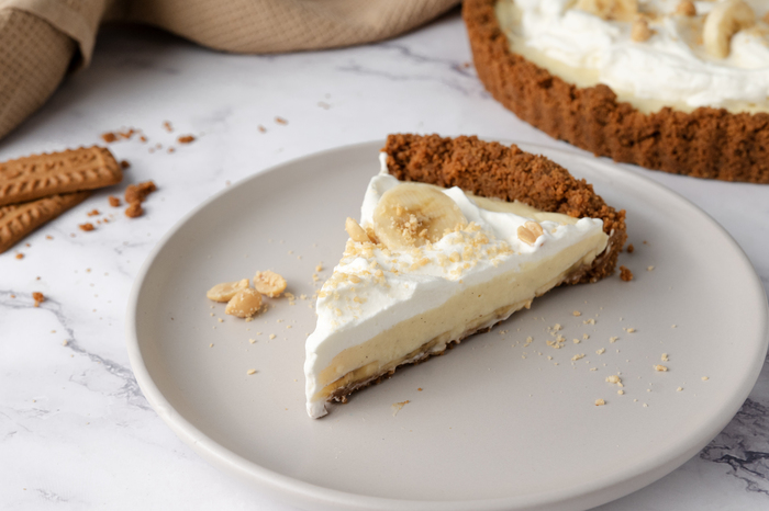 2 Ricoprire la torta con la panna montata, guarnire con fettine di banana e cospargere con arachidi tritate per una maggiore consistenza e sapore.