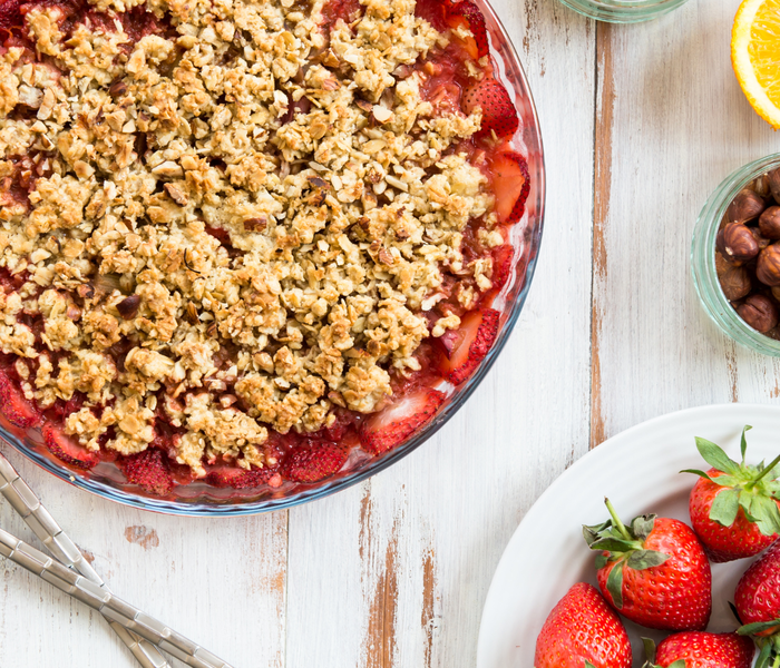 Distribuire il crumble in modo uniforme sulle fragole nella teglia.