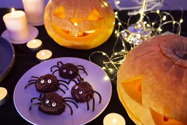 Con una piccola spatola, distribuire la glassa al cioccolato in modo uniforme sui muffin e passarli nelle briciole di cioccolato. Posizionare due caramelle a forma di occhio su ogni muffin. Aggiungete quindi le zampe di cioccolato a forma di spaghetti di cioccolato ai ragni. Servire i ragni di cioccolato.