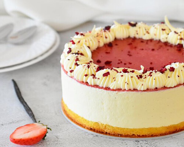 1 Per prima cosa, prepara lo strato di fragole, perché deve essere ben solidificato. Immergi i fogli di gelatina in acqua fredda per almeno 5 minuti. Scalda le fragole con lo zucchero finché non si ammorbidiscono e riducile in purea. Sciogli i fogli di gelatina strizzati nella purea di fragole calda. Versa la purea in una tortiera o in una teglia a cerniera da 14 cm (4 cm in meno del diametro della torta), che avrai foderato con una pellicola di plastica e avvolto ben stretto. Metti nel congelatore perché solidifichi.
